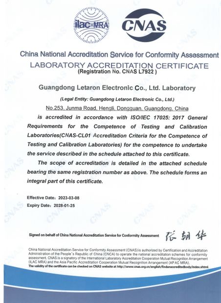 Letaron построил качественный научно-исследовательский центр технологий и установил стабильные отношения сотрудничества с авторитетными органами по сертификации в стране и за рубежом,которая может предоставлять услуги по тестированию и сертификации с единым прицепом для предприятий в верхней и нижней части сетиВ 2021 году Министерство промышленности и информационных технологий оценило его как единую платформу услуг по обеспечению национальной инфраструктуры качества (NQI).Это стало уникальным конкурентным преимуществом для Letaron..